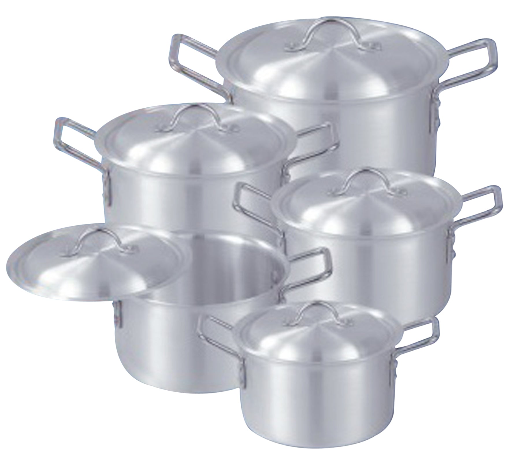 Set Includes: 5 aluminum cooking pots in assorted sizes with matching lids