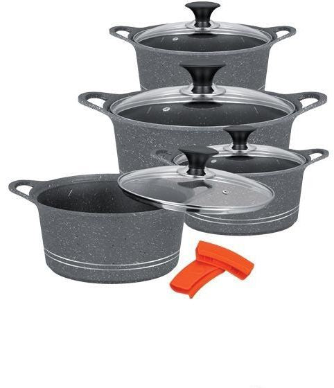 Crafted through eco-friendly production, these pots feature a premium granite non-stick coating for healthier cooking with minimal oil and effortless cleaning. Suitable for all heat sources, including induction cooktops, this set is perfect for everyday cooking and special occasions alike.