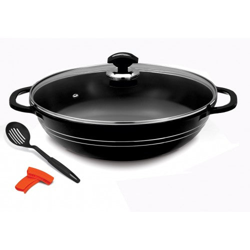 Omega Granite Non-Stick Karahi Wok with Glass Lid – Eco-Friendly, Induction Compatible + Free Serving Spoon & Silicone Handle Grips